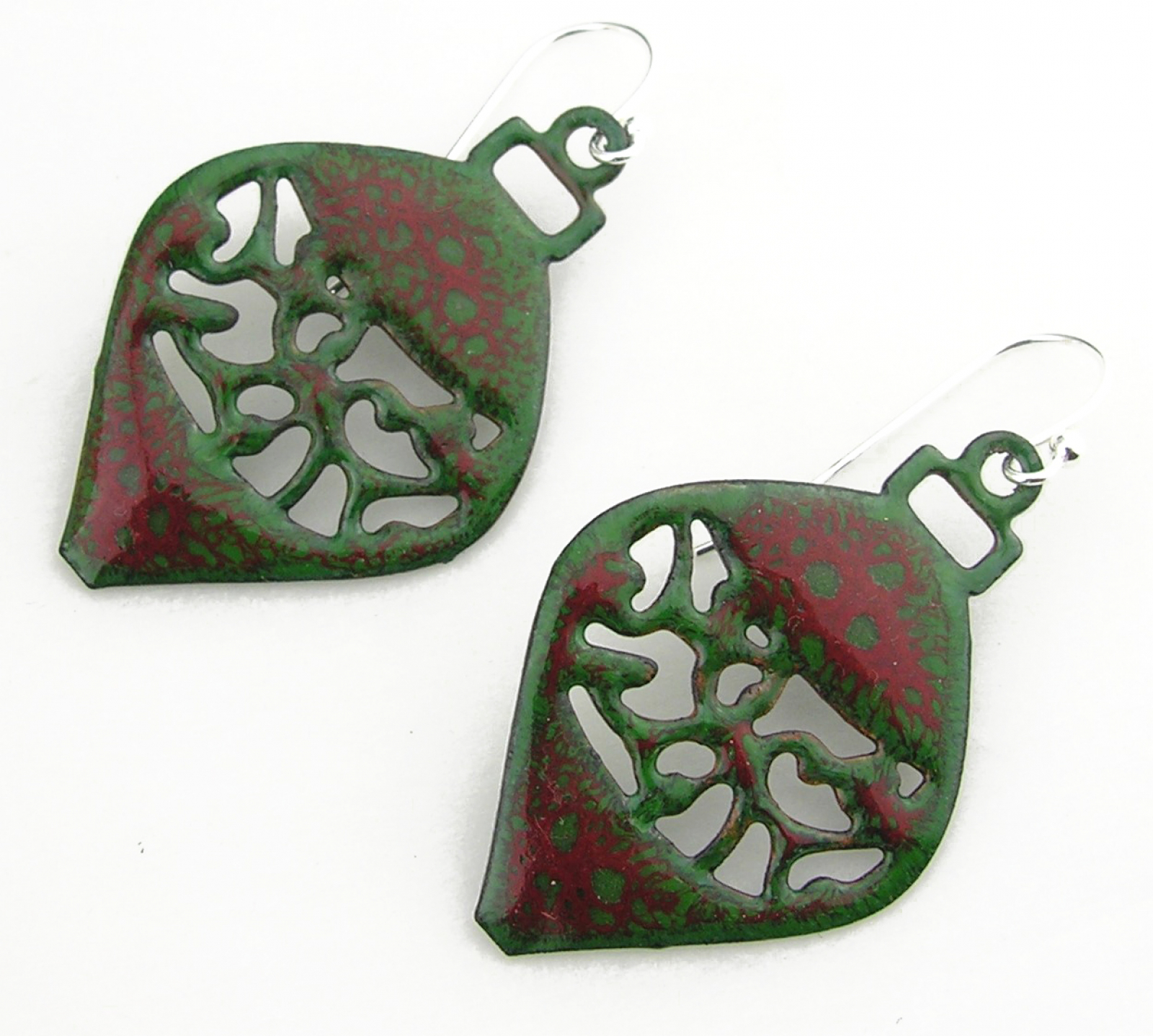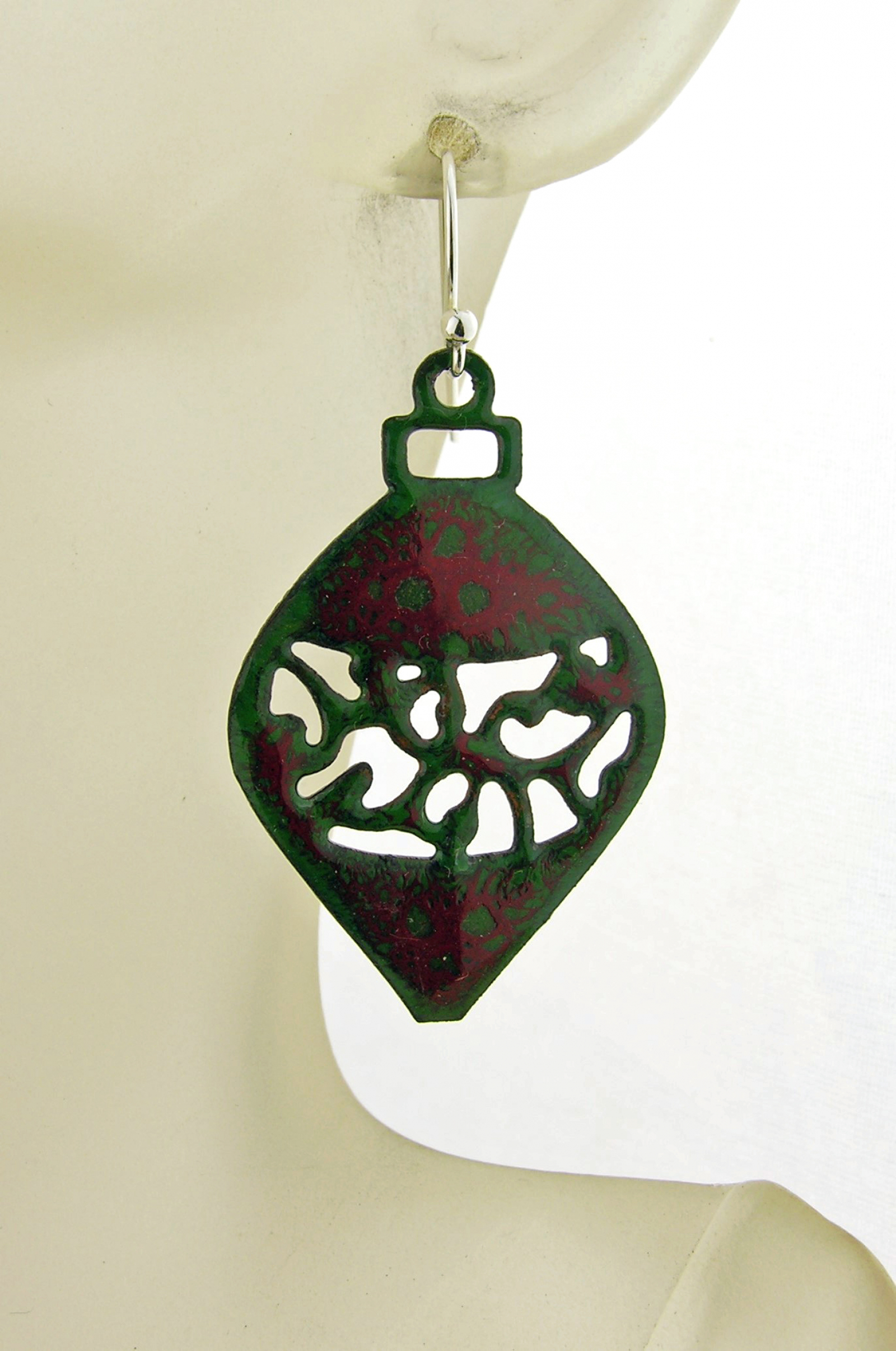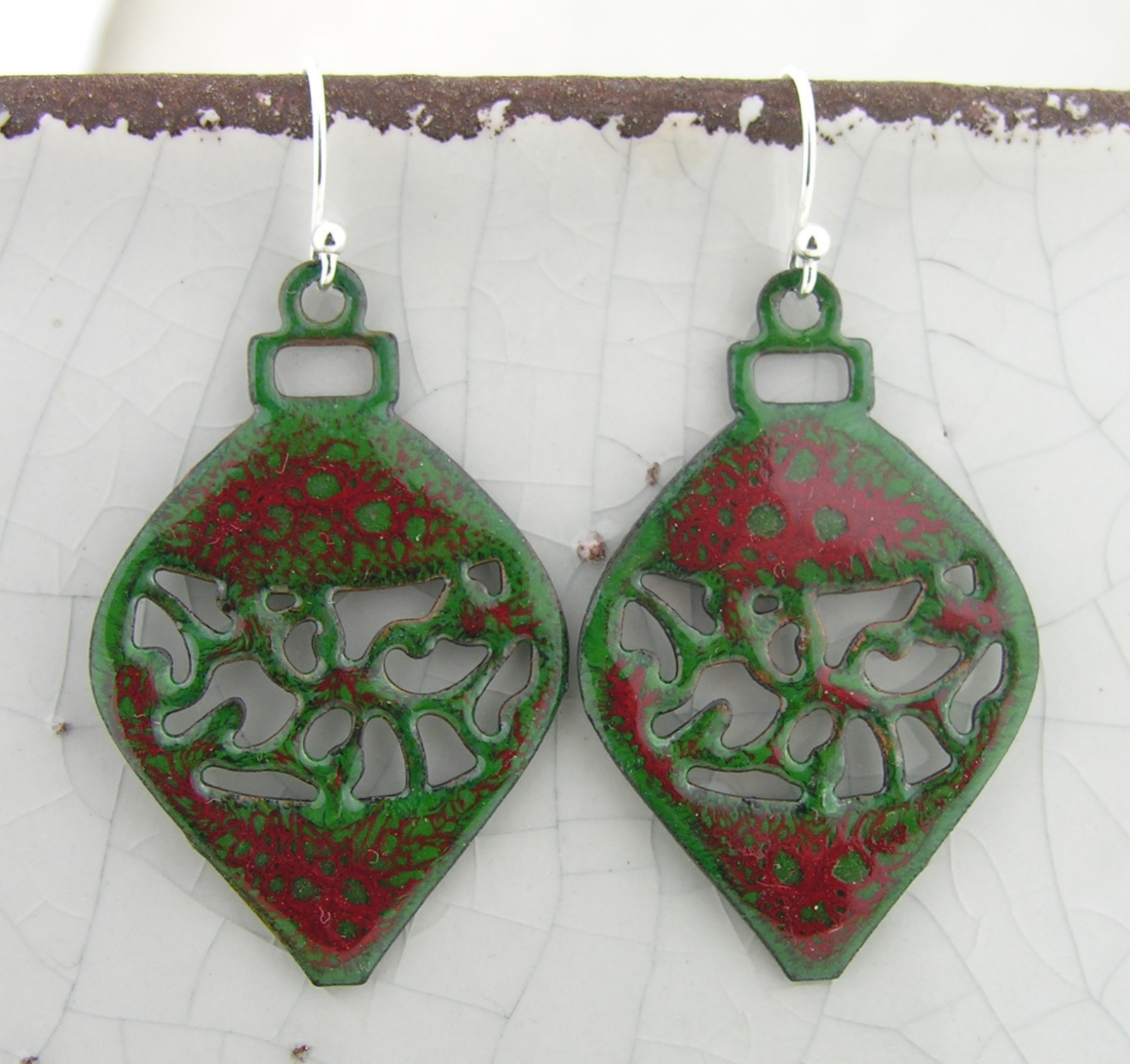 Shaped like vintage ornaments, each pair features a delicate open-filigree detail and a rich crackle-enamel finish. The deep evergreen base and red crackle pattern add a warm, organic feel, echoing the colors of winter berries and pine.