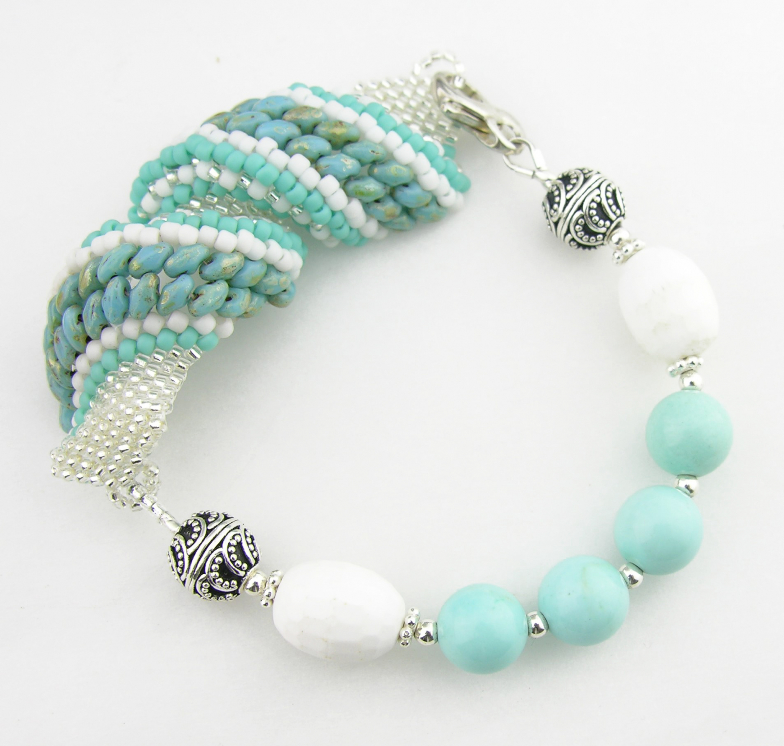 Turquoise & White Agate Gemstone Bracelet – Bead Woven Spiral Design, Sterling Silver Clasp and accents